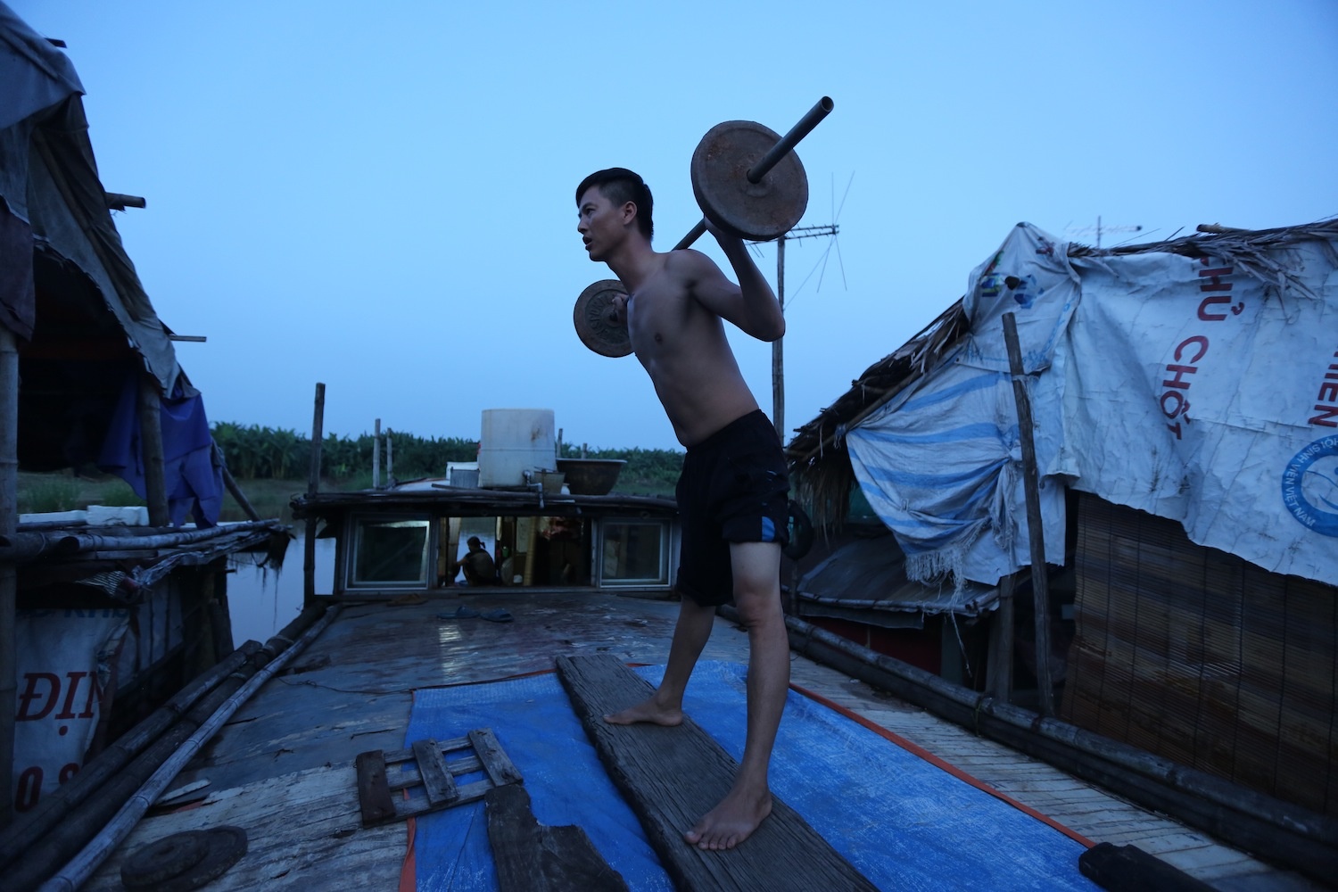 Mặc dù công việc cực nhọc nhưng chàng trai vẫn đều đặn tập thể dục hàng ngày trên chiếc thuyền mà hai vợ chồng đã sinh sống gần chục năm.