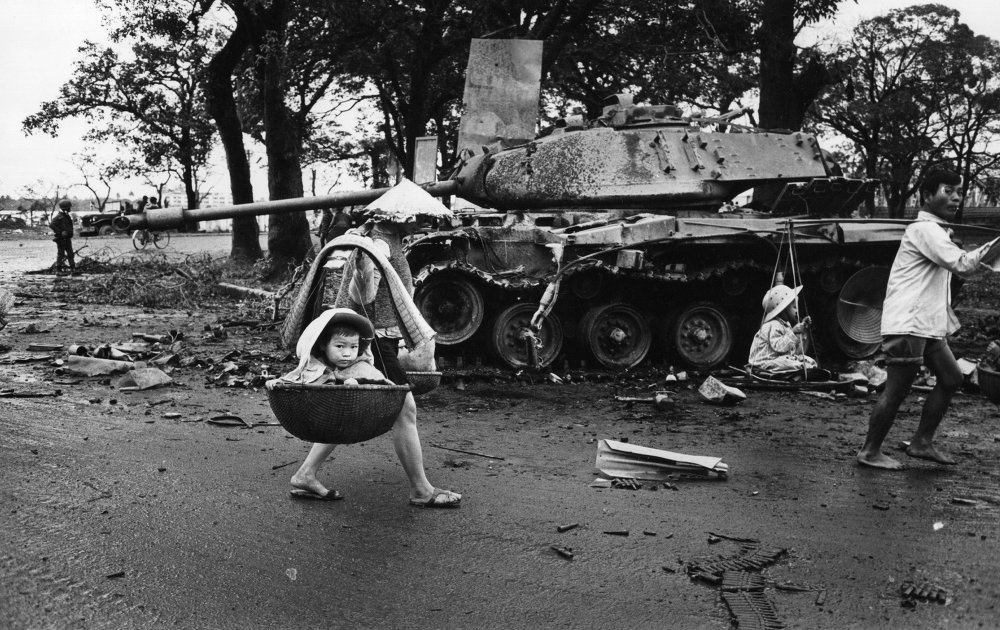 Người dân phải dùng đòn gánh để đưa con tới nơi trú ẩn. Theo số liệu ước tính, tổng số người Việt Nam thiệt mạng trong cuộc chiến từ 800.000 đến 3,1 triệu người, Sputnik đưa tin.