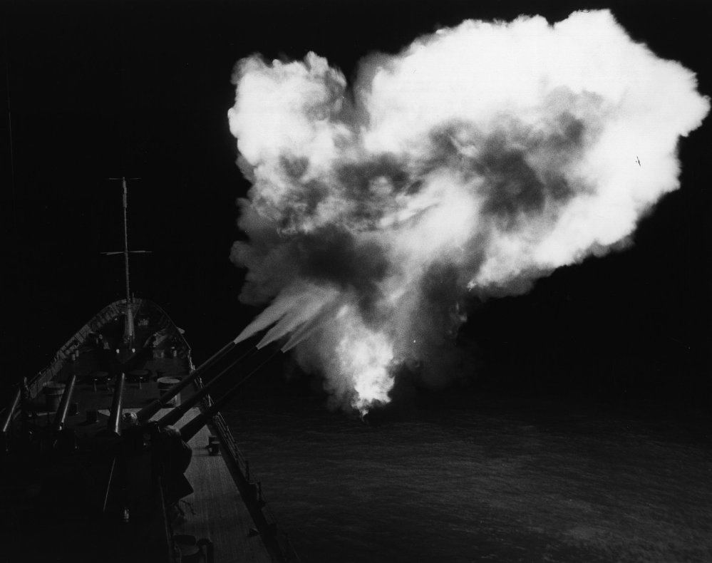 Tàu tuần dương Canberra của quân đội Mỹ phóng hỏa lực. Mỹ đã chi 352 tỷ USD cho các hoạt động quân sự trong cuộc chiến.