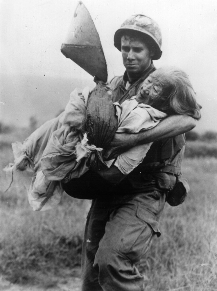Sĩ quan thủy quân lục chiến Mỹ bế một phụ nữ Việt Nam lên trực thăng cứu hộ.