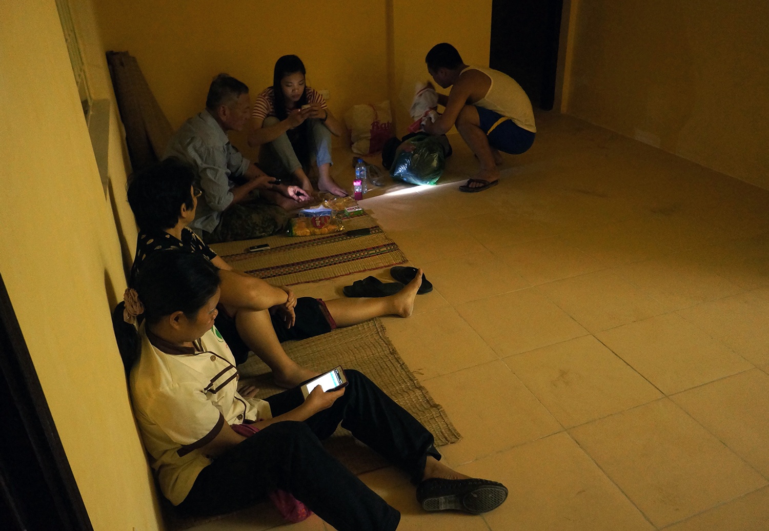 Phần lớn người dân đến ở tạm đều không thể mang theo vật dụng cá nhân do hiện trường khu nhà cổ được lực lượng chức năng phong tỏa. Anh Nguyễn Thanh Tùng soi đèn pin vào túi đồ kiểm tra xem có vật dụng gì có thể dùng. Thanh niên trẻ tuổi cho biết, chính quyền thông báo các gia đình không được về nhà đêm nay để phục vụ công tác điều tra cũng như phòng tránh việc đổ sập tiếp tục xảy ra. "Hai vợ chồng cũng chỉ kịp mượn của người bạn gần nhà manh chiếu để ở tạm. Chúng tôi cũng chưa biết thời gian sẽ là bao lâu, trước mắt phải cố gắng trong đêm đầu", anh Tùng nói.