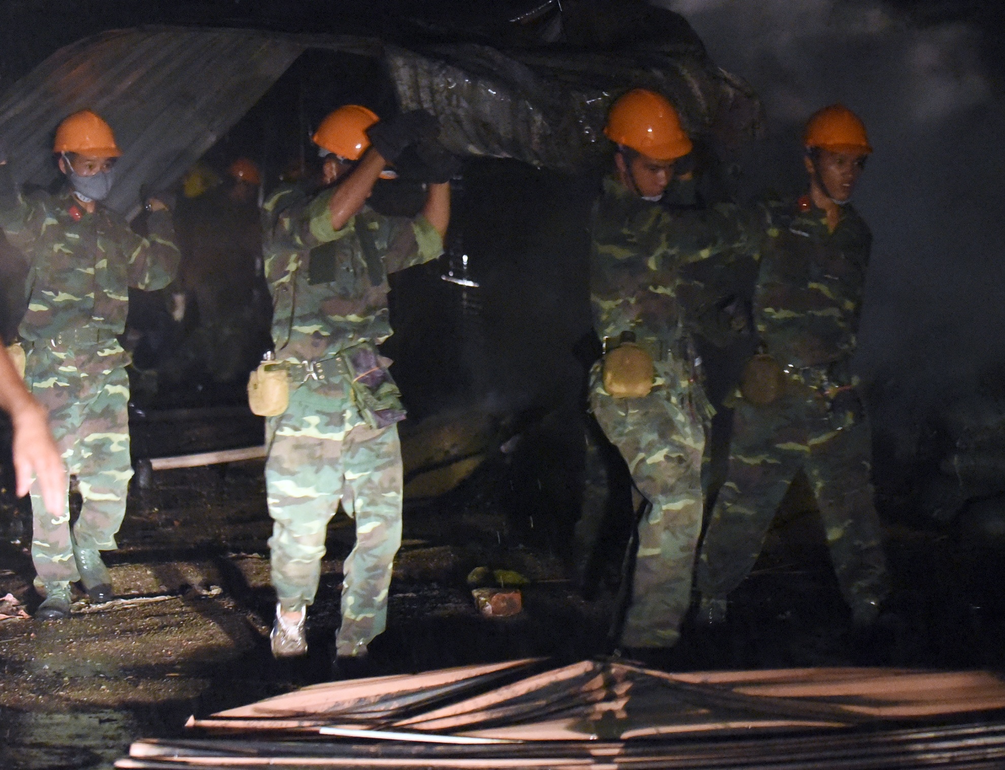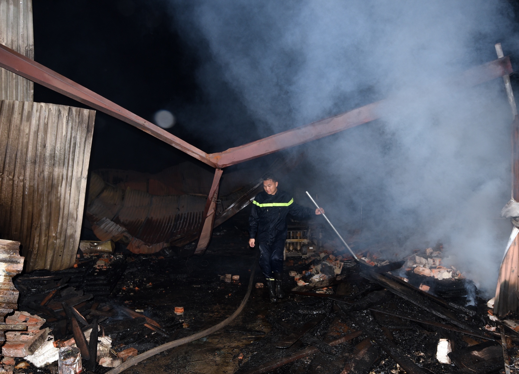 Đến 20h30, đám cháy được dập tắt nhưng lực lượng chức năng vẫn phải làm nguội các bao tải than hoa, tránh cho ngọn lửa bùng phát trở lại.