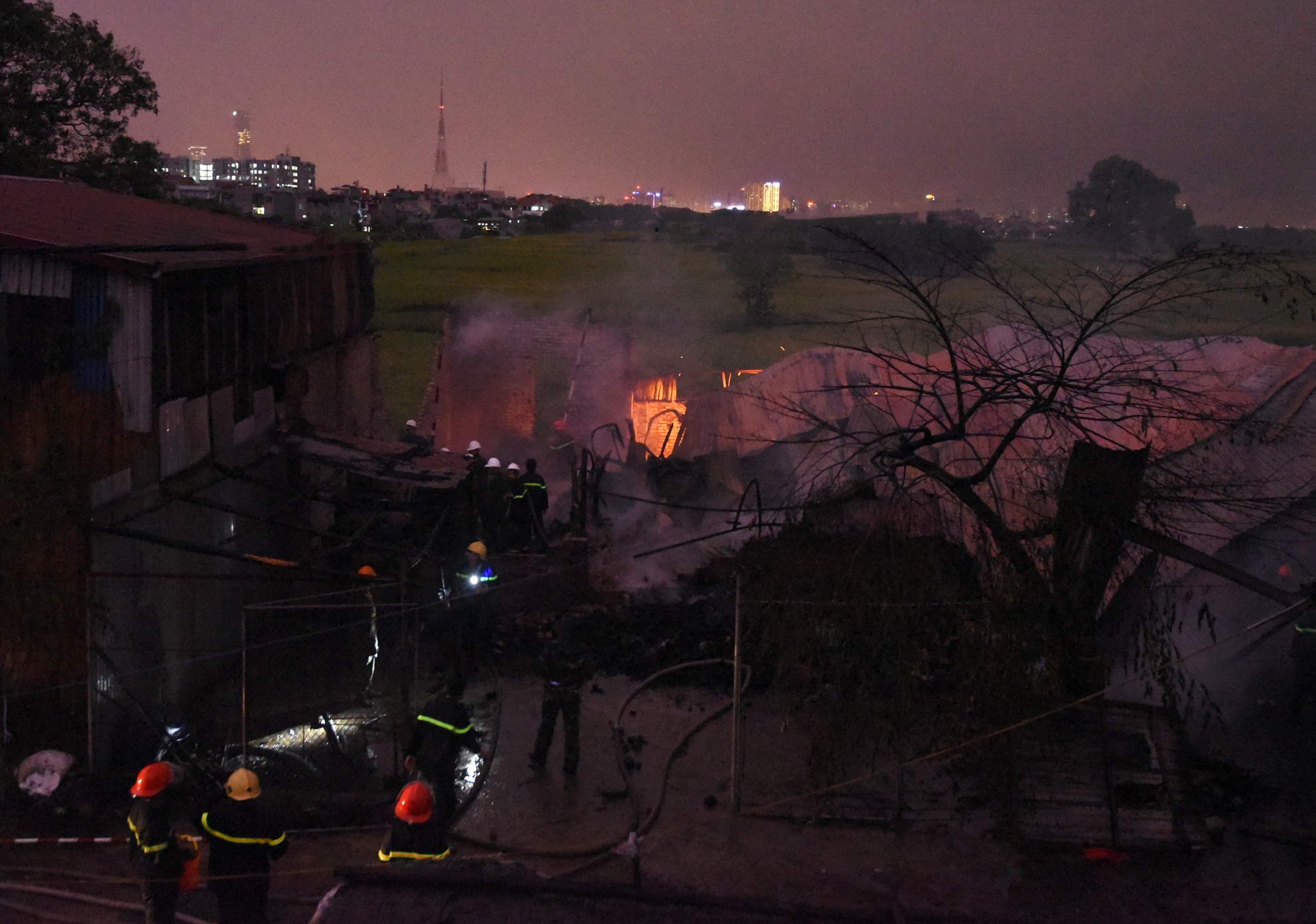 | 4 xe chữa cháy của đội chữa cháy chuyên nghiệp Hà Đông cùng 2 xe cấp nước của công ty môi trường được điều động. Do ngõ nhỏ, mặt đường lầy lội nên các xe chữa cháy phải dòng dây khá xa từ phía tỉnh lộ 70 vào. |
