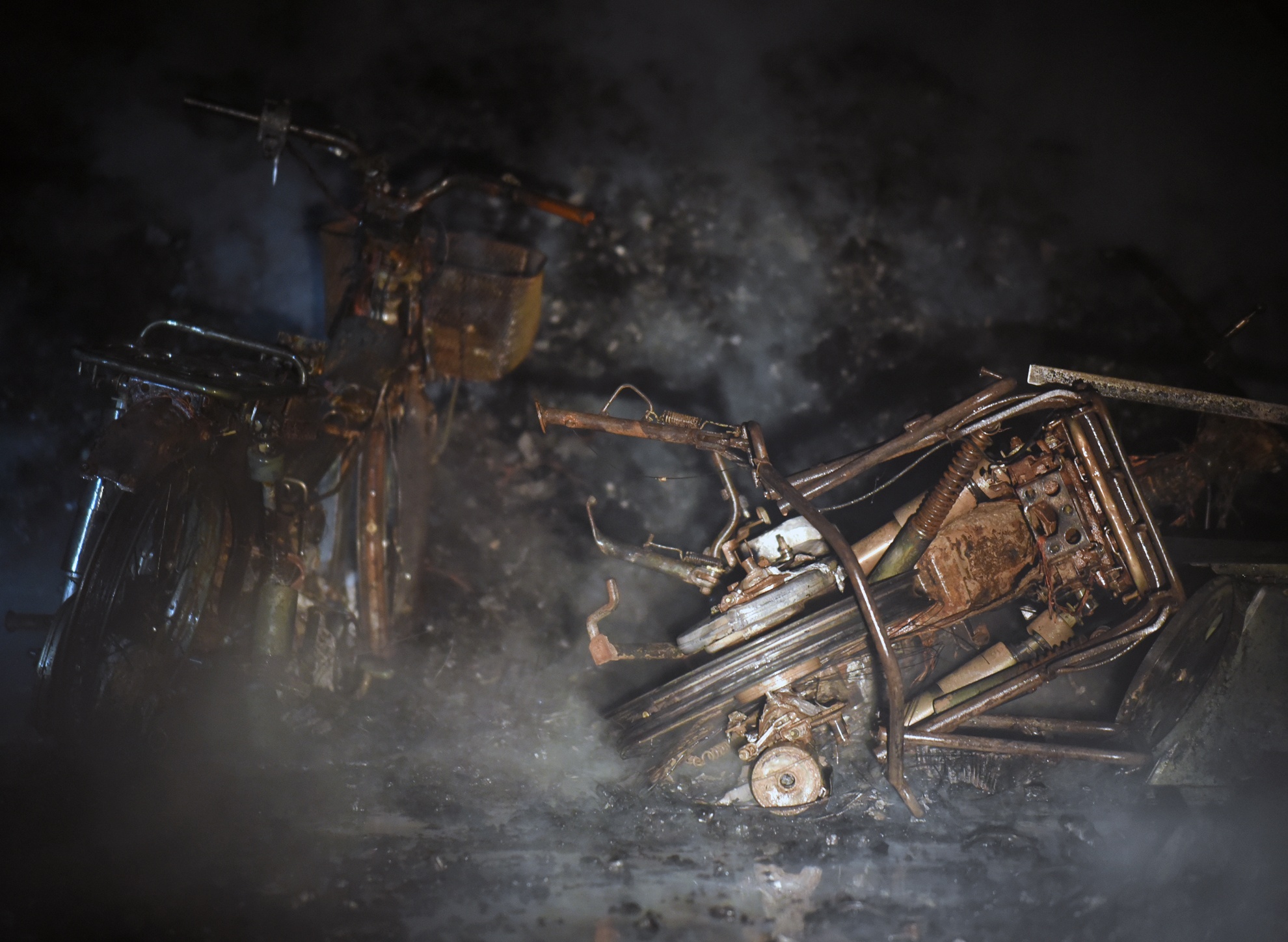 Hai xe máy nằm cạnh đống than đã được dập tắt cháy trơ khung.