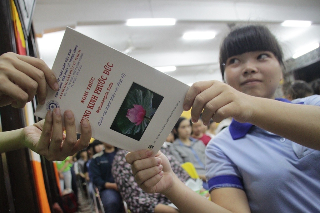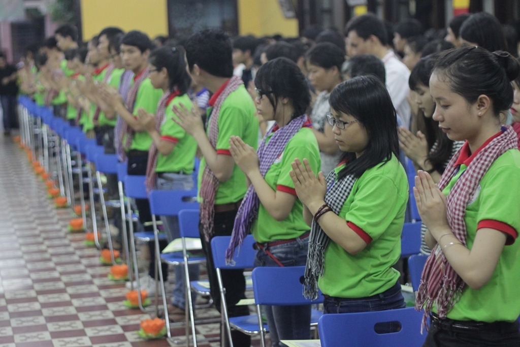 | Các thí sinh đọc kinh Phước đức theo thầy và cùng với các nhà sư niệm kinh. |