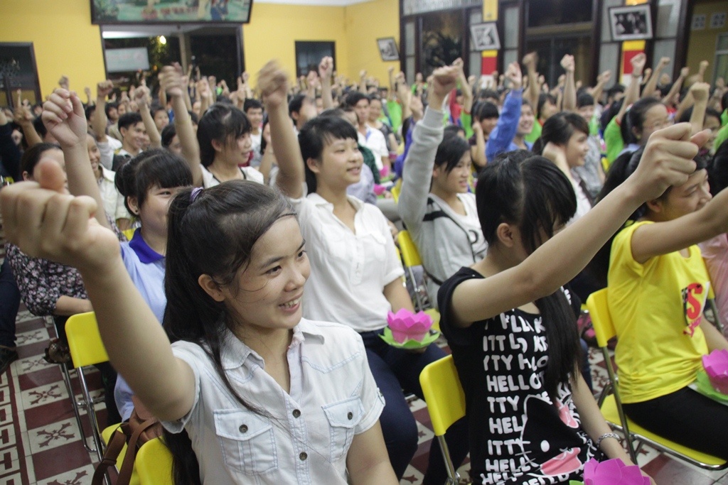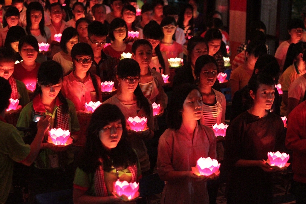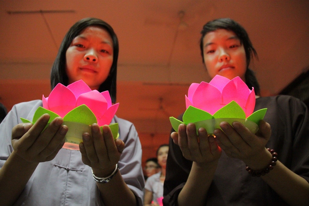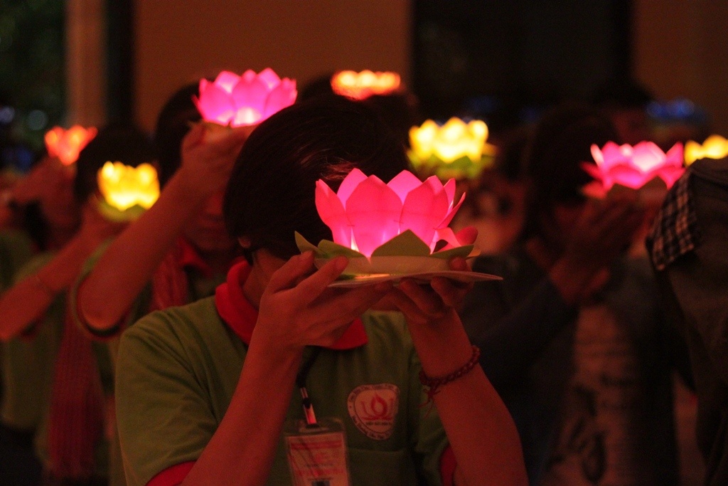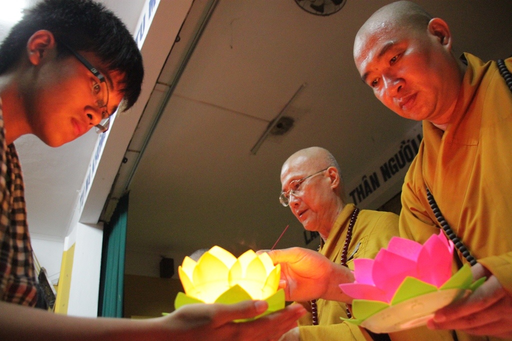 | Hoạt động chính lá thắp nến cầu nguyện. Lần lượt từng thi sinh tiến đến chỗ sư thầy để được thắp sáng đèn hoa đăng. |