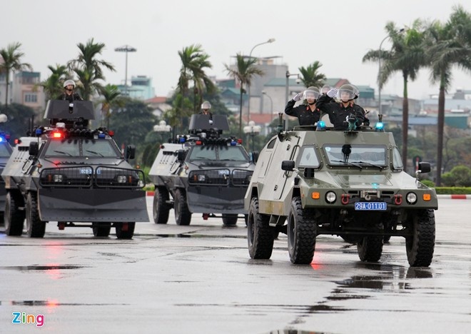 Dàn xe tăng thiết giáp và xe bọc thép đặc chủng của Công an Hà Nội trong lần ra quân bảo vệ Đại hội đồng Liên minh Nghị viện thế giới lần thứ 132 (IPU 132) diễn ra hồi đầu năm 2015. |