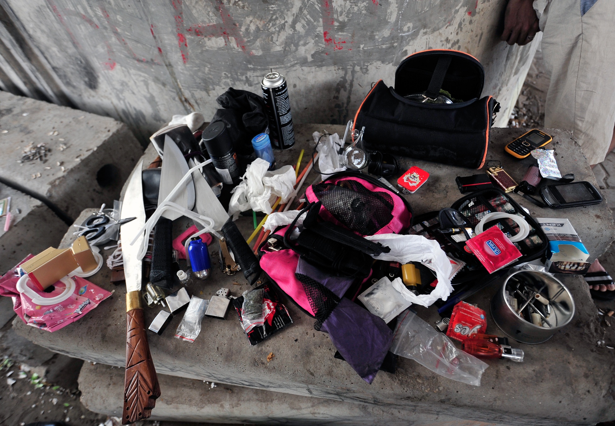Tại chốt kiểm tram cảnh sát phát hiện trong 2 túi anh ta mang theo có hung khí, bột trắng, cóng, khò đập đá, bao cao su chưa sử dụng và nghi vấn chất gây nghiện. Nam thanh niên được xác định là Lê Đức Thịnh (31 tuổi, ở quận Thanh Xuân, Hà Nội).