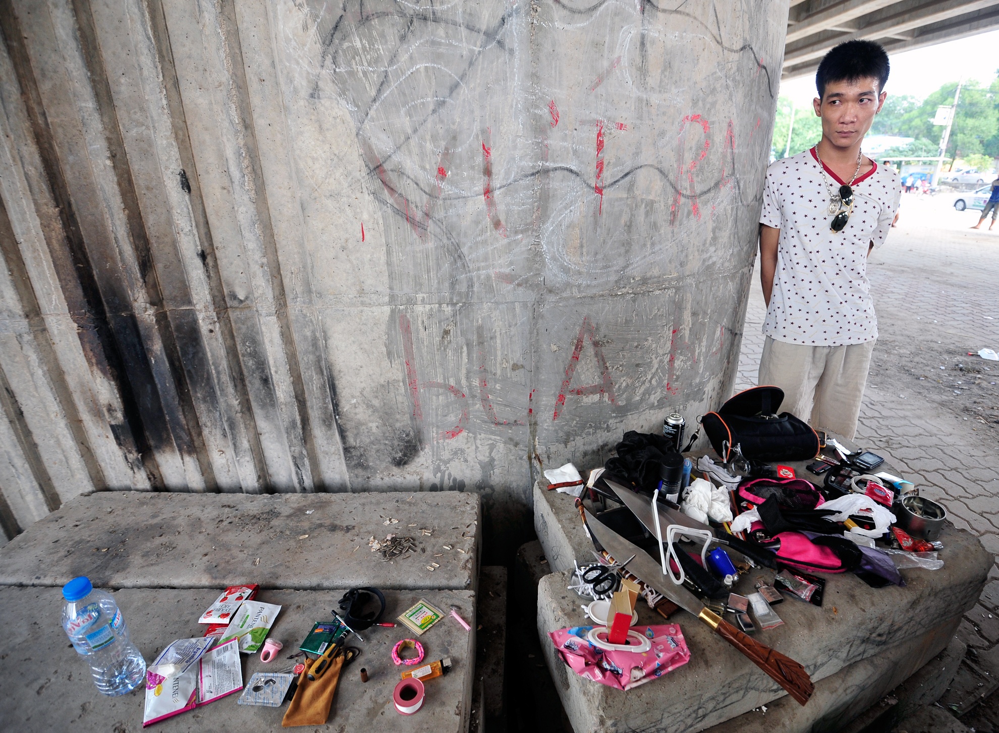 Dao cán dài, dao bấm, 2 dao bầu và các vật dụng khác trong túi xách mang theo.