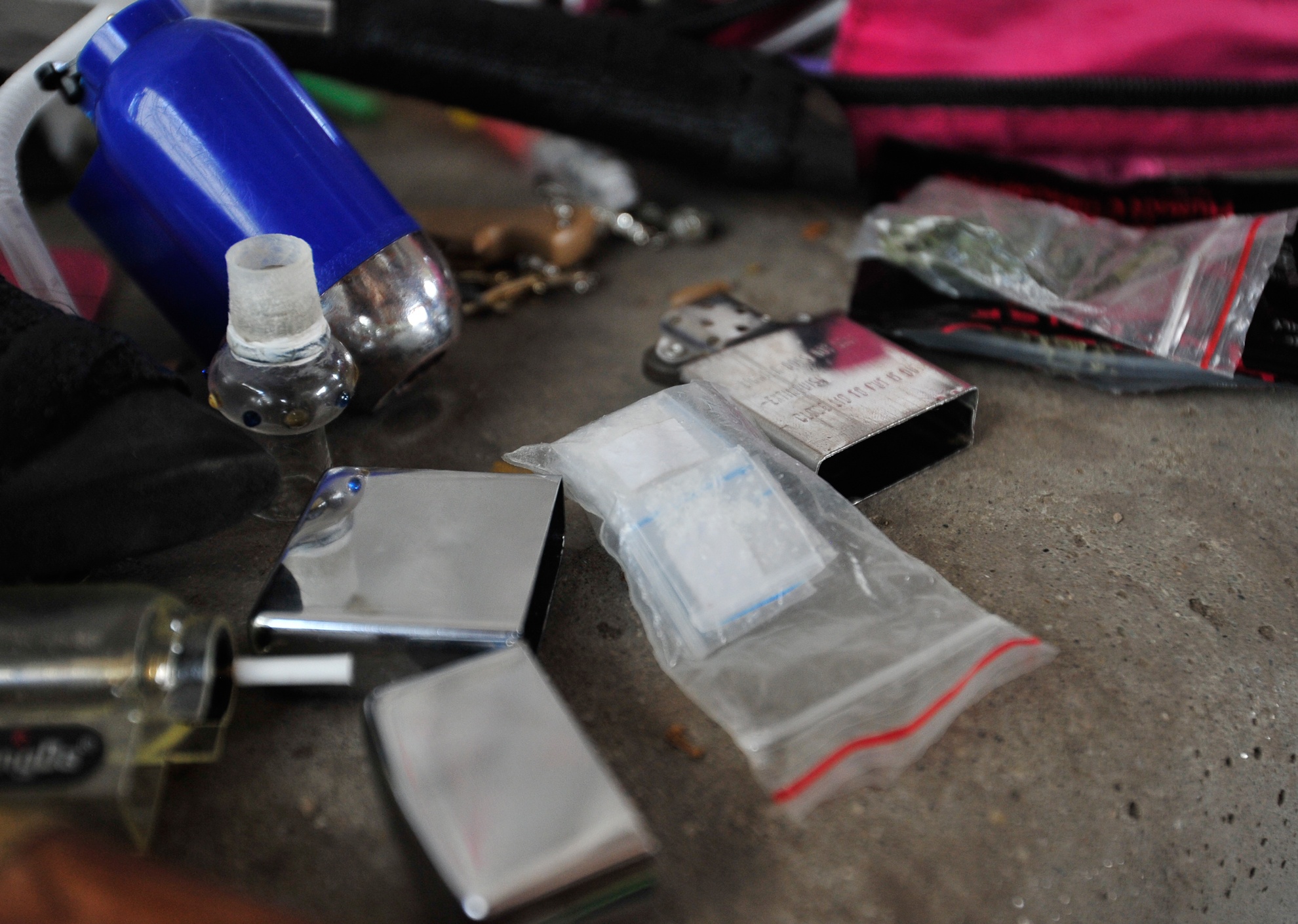 Túi cỏ, và một túi chứa 9 gói bột nghi là ' ma tuý đá' nhét trong bật lửa Zippo.