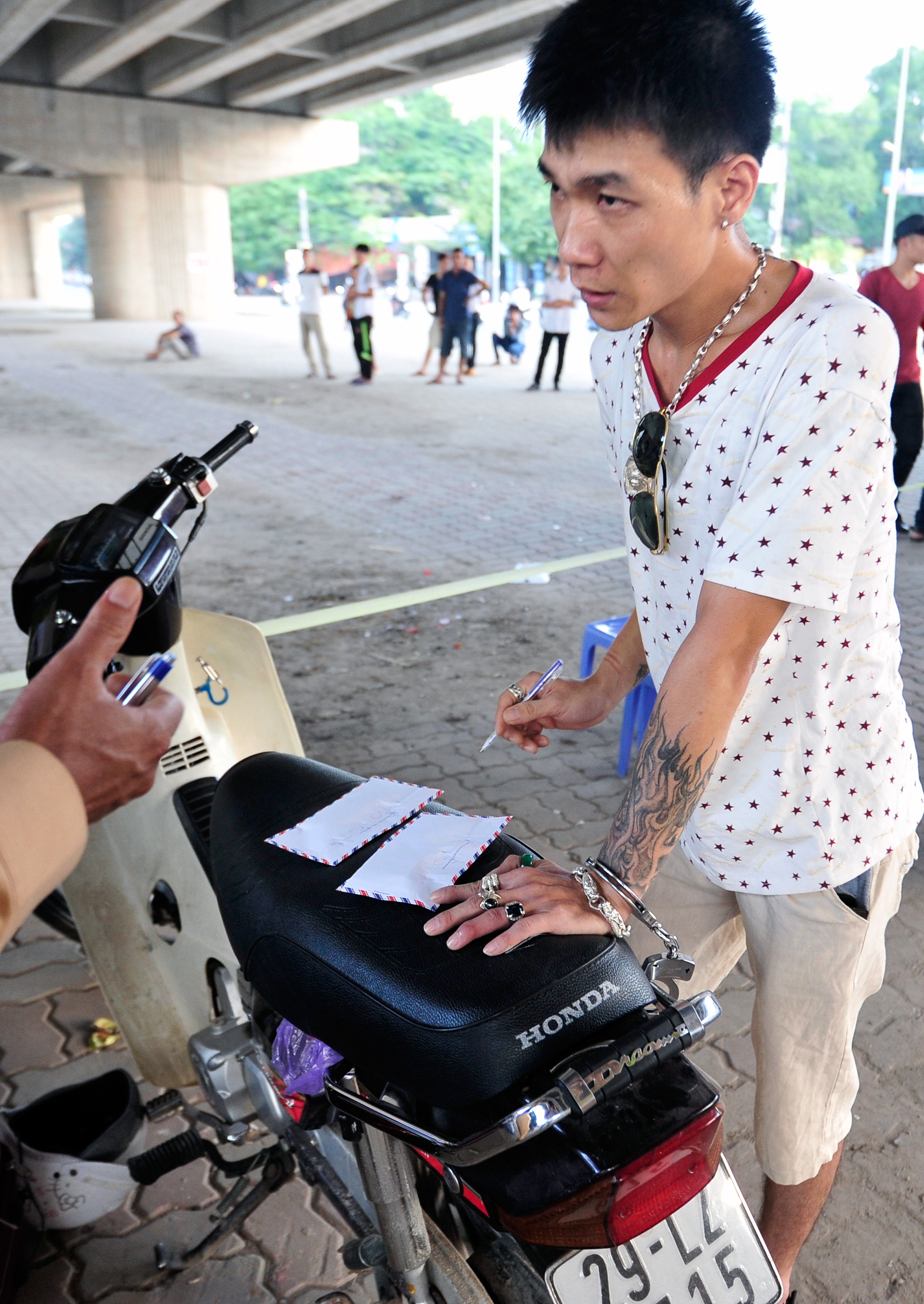 Người đàn ông 31 tuổi với hình xăm trên tay được bàn giao cho công an phường sở tại điều tra.