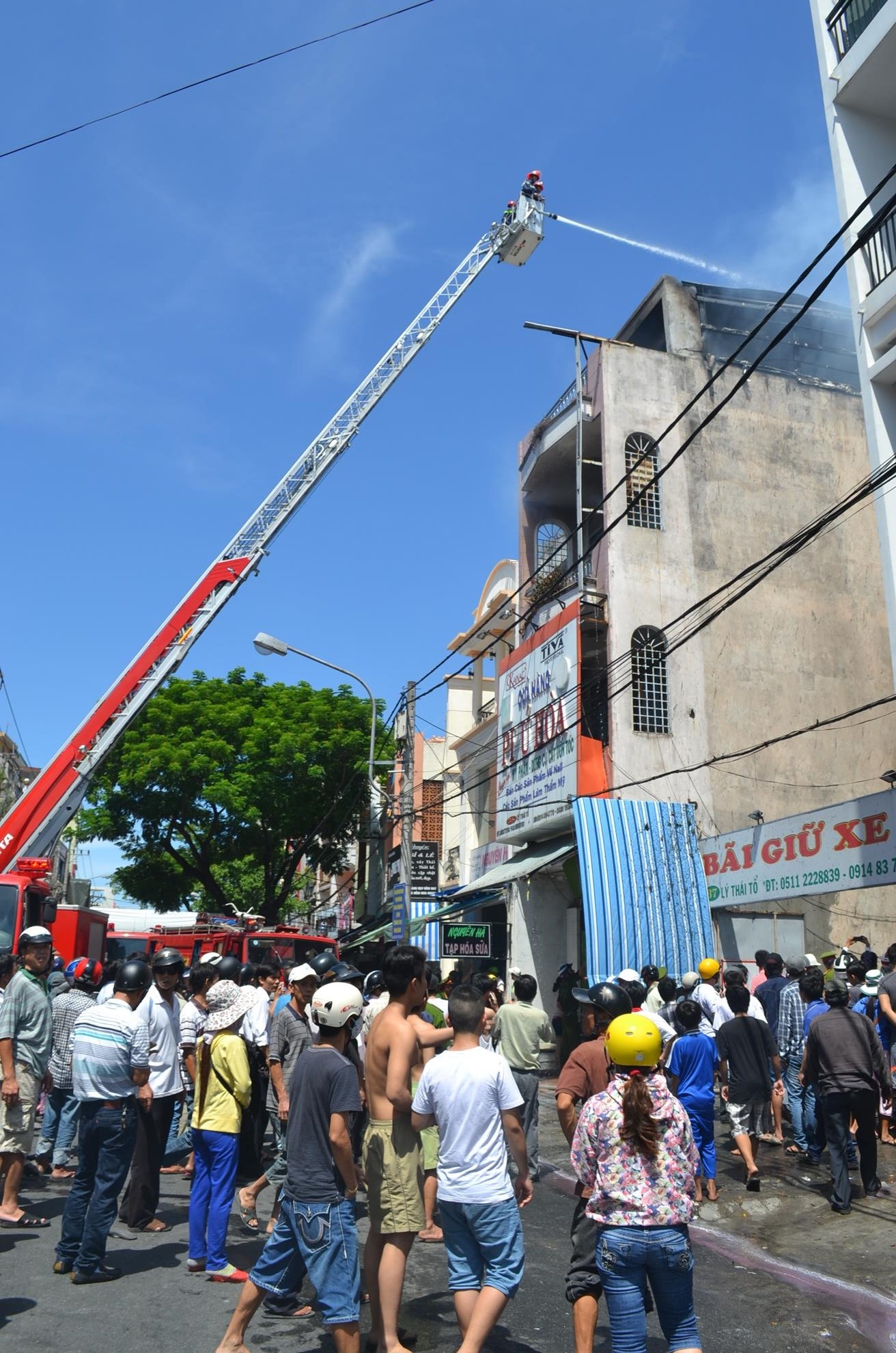 12h45 ngày 12/7, cửa hàng Phú Hòa - chuyên bán mỹ phẩm, dụng cụ cắt tóc và các sản phẩm làm thẩm mỹ (số 35 Lý Thái Tổ, phường Thạc Gián, quận Thanh Khê, Đà Nẵng) đã xảy ra vụ cháy lớn.