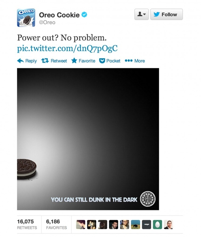 5. “Bạn vẫn có thể nhúng bánh vào sữa trong bóng tối” (Oreo)Chiến dịch quảng cáo này của Oreo không theo kiểu truyền thống như xuất hiện trên báo, tạp chí hay truyền hình mà được đăng tải lên mạng xã hội Twitter. Đây có lẽ là ví dụ tuyệt vời nhất của marketing hiện đại, hình thức sẽ trở nên phổ biến trong tương lai. Oreo đã tung ra chiến dịch này trong dịp diễn ra Siêu cúp Bóng bầu dục Mỹ Super Bowl năm 2013. Trong nửa giờ mất điện, Oreo đã thiết kế và tung ra quảng cáo này (trong ảnh) với slogan “Bạn vẫn có thể nhúng bánh vào sữa trong bóng tối” và được hàng nghìn người chia sẻ lại trên Twitter. Theo Oreo, lượng người theo dõi đăng tải này lên tới hàng trăm người chỉ trong vài phút. |