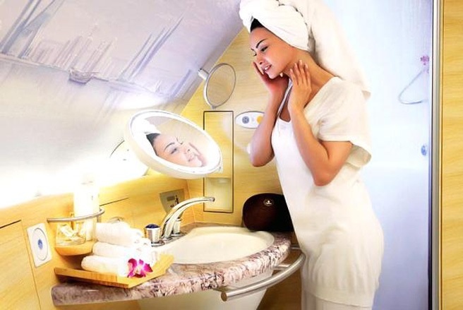 Ông Rick Seaney, Giám đốc điều hành FareCompare.com, từng thốt lên đầy ngạc nhiên khi trông thấy một phòng tắm thực sự trên một chiếc máy bay. Tuy nhiên, thực tế là dịch vụ phòng tắm cho khách đi khoang hạng nhất đã xuất hiện khá lâu. Vào năm 2008, hãng Emirates đã bắt đầu cung cấp dịch vụ này cho khách hàng khoang hạng nhất trên các hành trình bằng máy bay A380.