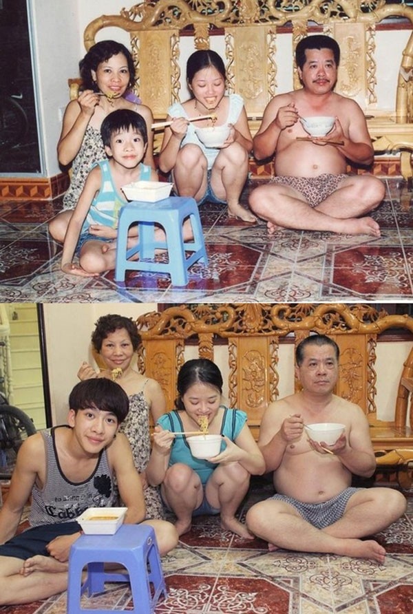 | Ảnh ngày ấy - bây giờ. Những khoảnh khắc vô giá trong quá khứ được tái hiện lại thật giống bức ảnh gốc và điều kì diệu hiện ra khi khoảnh khắc 2 bức ảnh quá khứ - hiện tại ấy, được đặt cạnh nhau. Trào lưu này từng gây sốt trên cộng đồng mạng thế giới một thời gian khá dài trước khi mê hoặc giới trẻ Việt. Tình cảm gia đình, tình yêu, tình anh em... là những chủ đề thường xuyên xuất hiện trong kiểu ảnh mang tính hồi tưởng cao này. Ảnh: NVCC. |