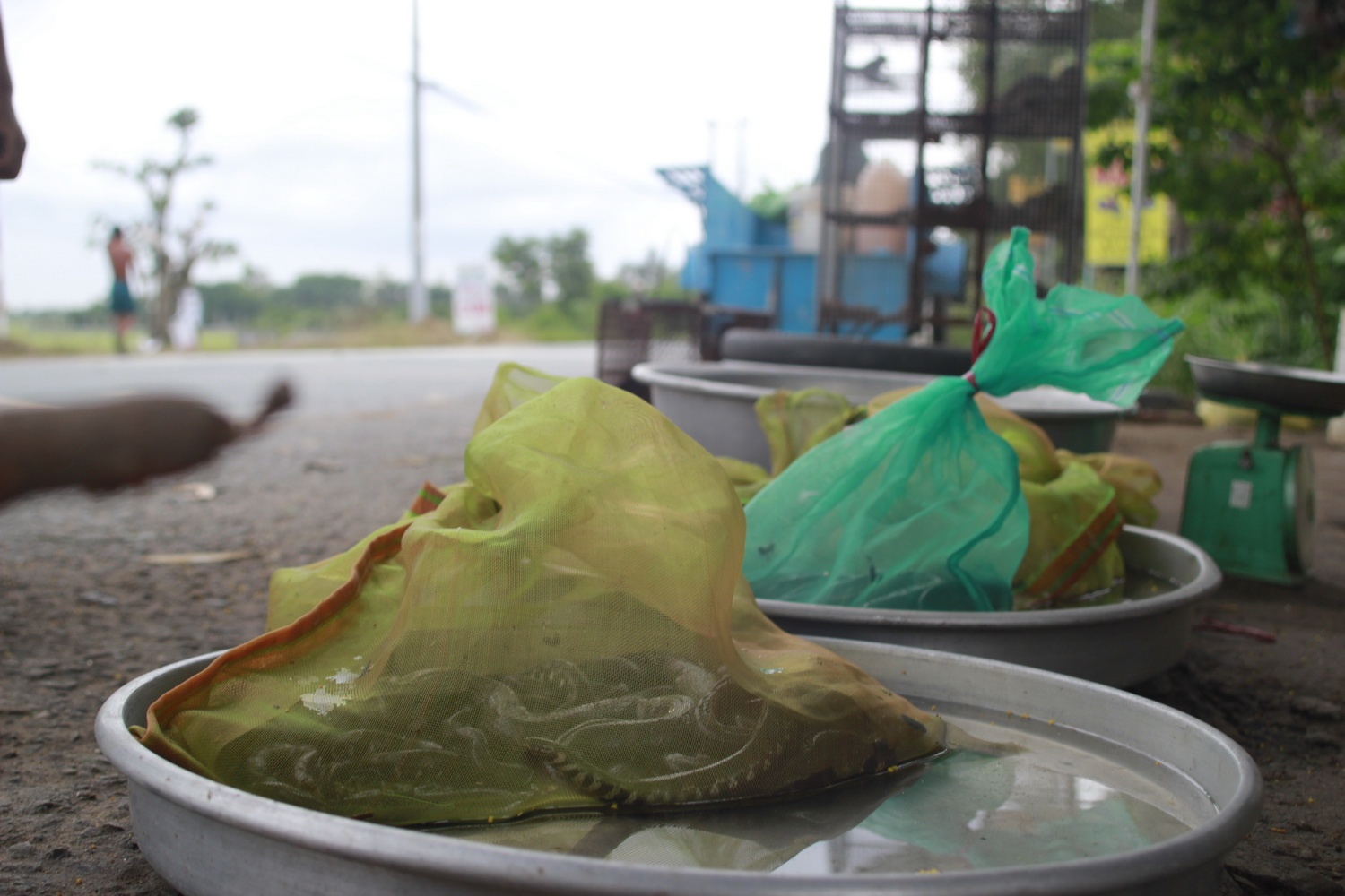 | Các loại rắn bỏ trong bao cước được bày bán bên đường ở Củ Chi |