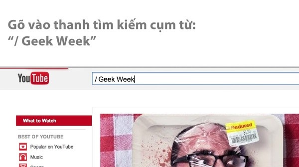 Tháng 8 năm ngoái, YouTube có tổ chức một sự kiện mang tên “Geek Week” nhằm khuyến khích và giới thiệu những sản phẩm thú vị của cộng đồng “geek”, những người có đam mê thật sự và bất tận cho một lĩnh vực nào đó. Nhân sự kiện này, nếu bạn gõ vào thanh tìm kiếm YouTube cụm “/ Geek Week” thì lập tức giao diện trang xem video phổ biến nhất hành tinh sẽ đổi sang nền đen đồng thời cùng font chữ giống hệt một màn hình lập trình. Đến nay, thủ thuật nhỏ này vẫn còn khả dụng.