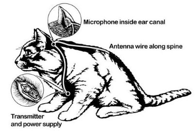 Sử dụng động vật cho các nhiệm vụ gián điệp là một trong những lựa chọn hàng đầu của CIA. Acoustic Kitty là một trong số đó. Họ cấy một cục pin nhỏ, một micro và ăng-ten vào đuôi một con mèo. Theo ý tưởng của CIA, con mèo sẽ đi lang thang để cần ăng-ten thu thập âm thanh xung quanh và truyền về cho trung tâm. Nhiệm vụ đầu tiên của mèo Acoustic Kitty là nghe lén cuộc nói chuyện giữa hai người đàn ông trong một công viên gần khu dành cho người Nga ở thủ đô Washington. Tuy nhiên, khi nhân viên CIA vừa thả mèo ra, một xe taxi cán chết con vật trong lúc nó đang lững thững sang đường. Chi phí cho dự án lên tới 25 triệu USD.