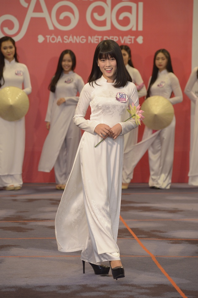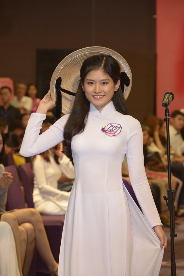 | Các thí sinh tự tin và duyên dáng trong phần thi trình diễn trang phục áo dài nữ sinh. |