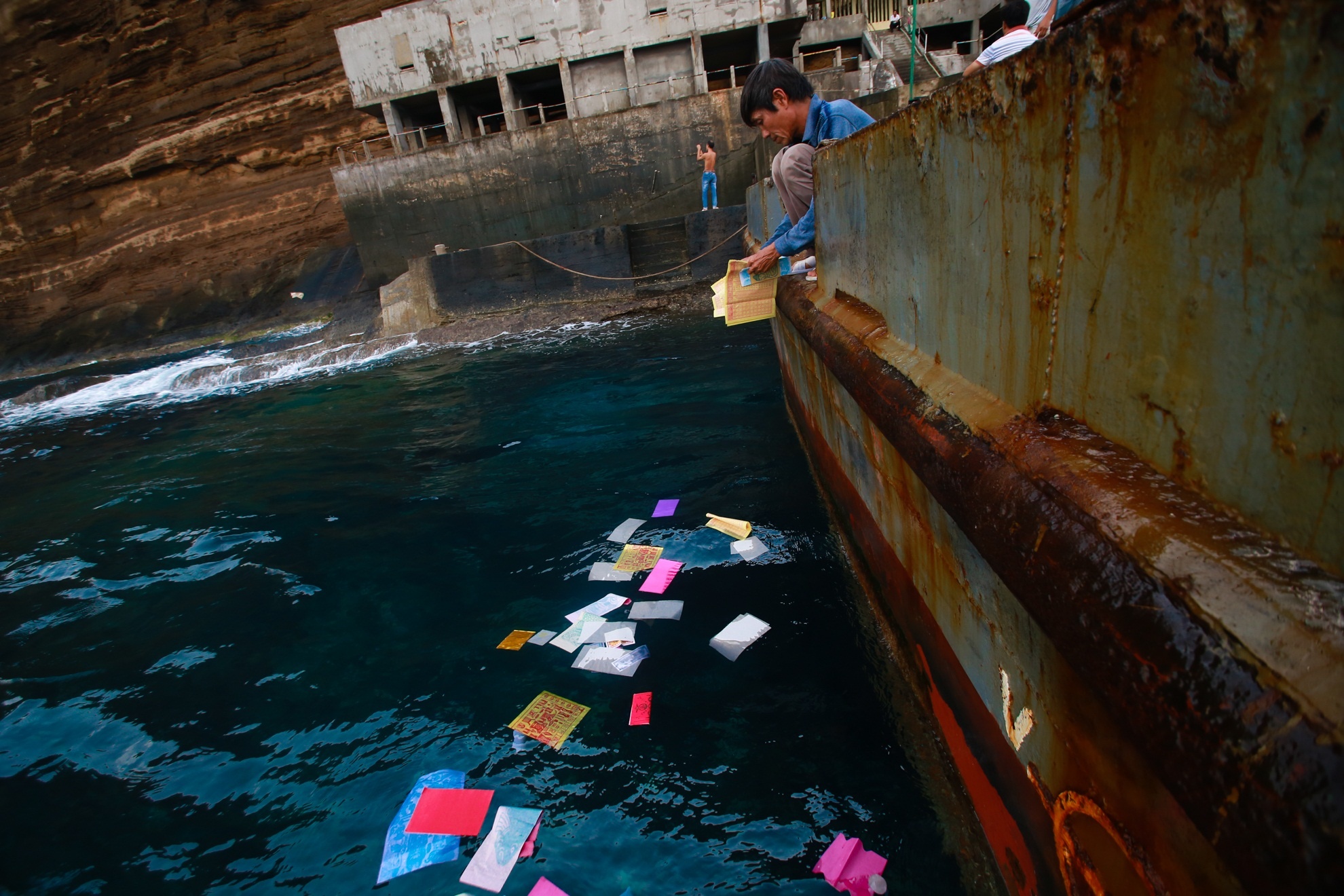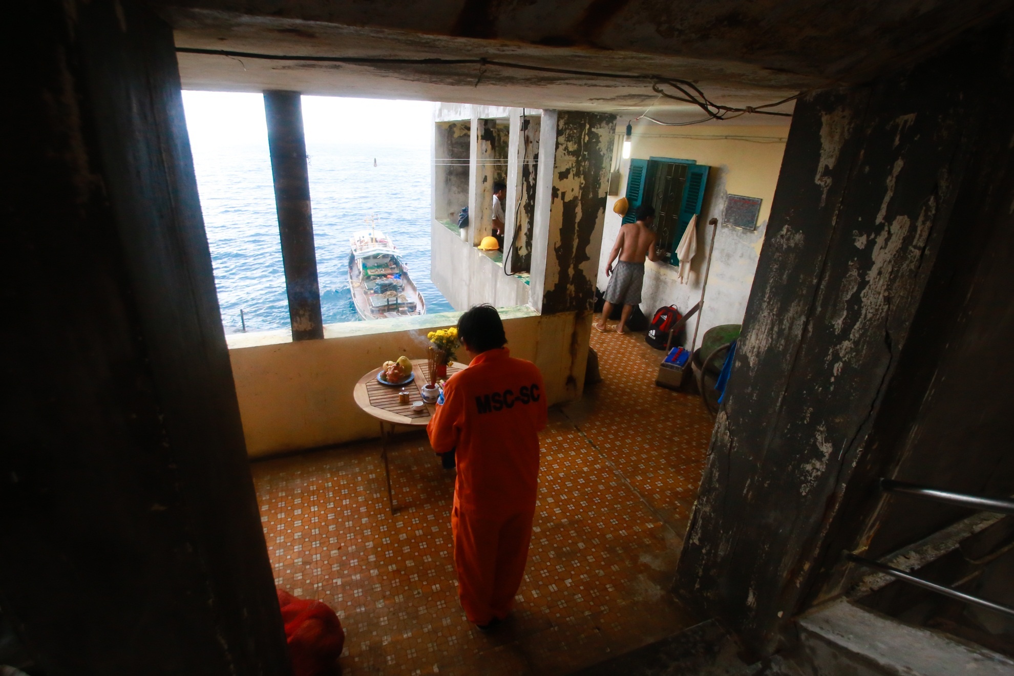 | Ở trên tàu, anh Tuấn thuyền trưởng cũng thực hiện cúng và đốt tiền vàng mã. "Cứ nghĩ đến việc có những anh em phải nằm lại dưới dòng nước lạnh lẽo rất đau lòng nên mỗi lần ra đều cúng như bày tỏ chút lòng thành mong đồng đội an ủi nơi chín suối", anh bùi ngùi. |