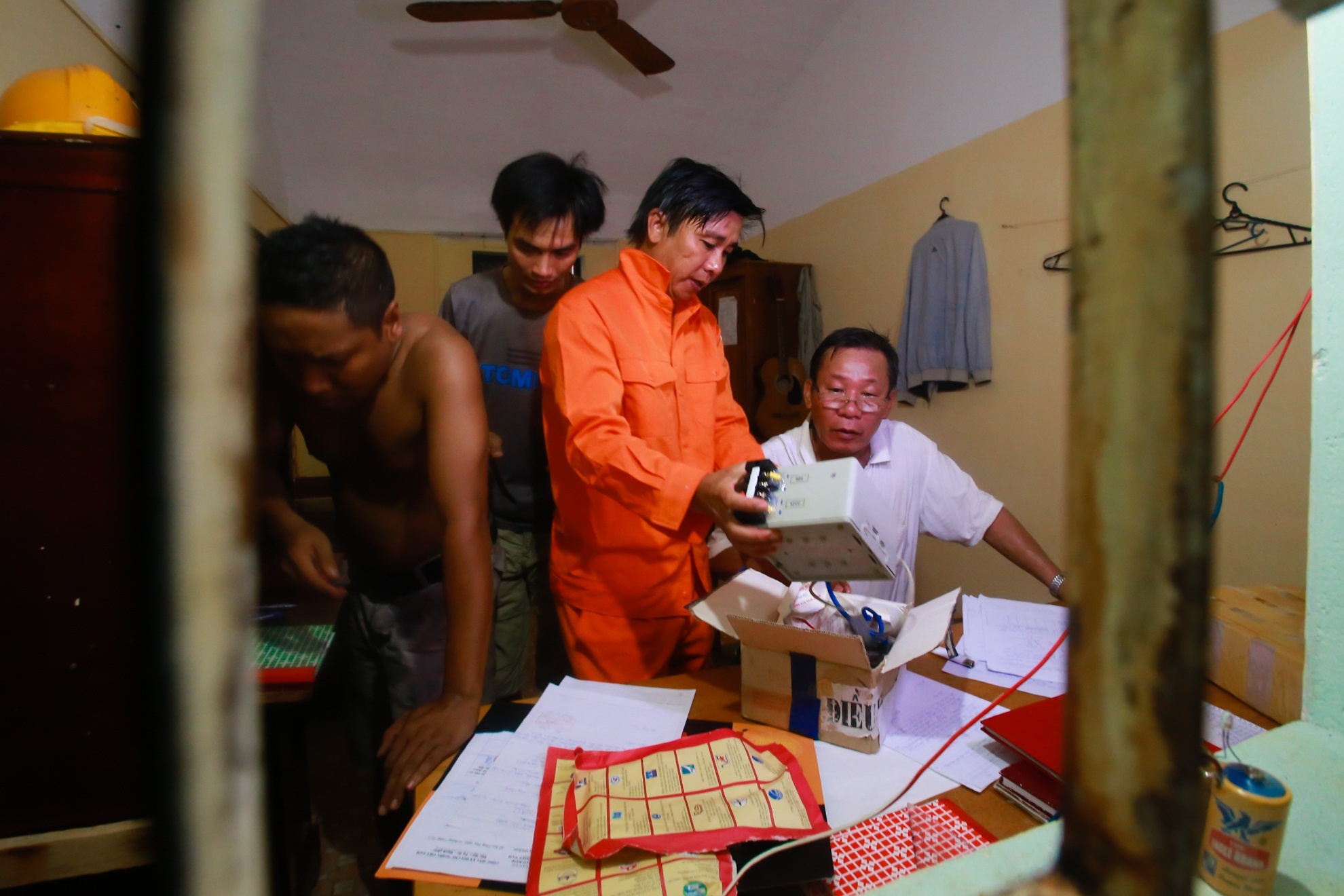 | Anh Đỗ Công Tuấn (áo trắng) thực hiện việc nhận bàn giao tài sản công việc trước khi thay ca. Dù ở hải đảo xa xôi nhưng công tác quản lý đều được mọi người thực hiện chặt chẽ, nghiêm túc. |