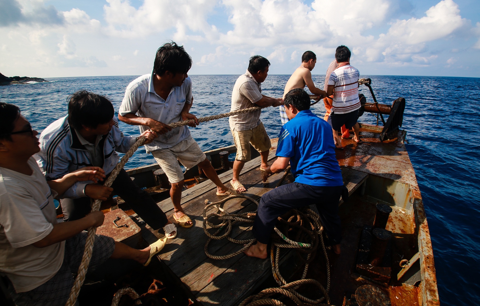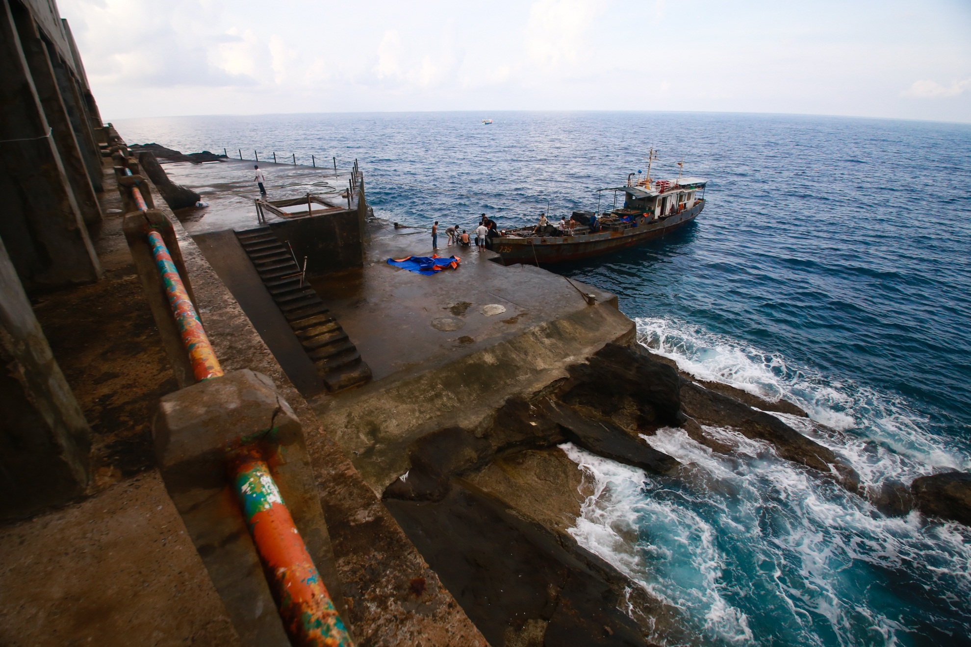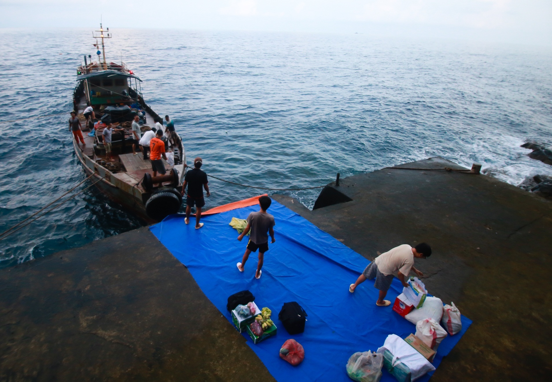 Từ đảo Phú Quý đến Hòn Hải khoảng 6 giờ lên đênh trên biển nhưng do phải né tránh biển động nên đoàn tiếp tế đã phải rất vất vả. Trong ảnh, tàu đã cập bến Hòn Hải - điểm A6 đường cơ sở lãnh hải Việt Nam, nơi được xem là cột mốc biên giới tự nhiên trên Biển Đông. Lúc này, dòng hải lưu chảy rất mạnh nên khi vận chuyển lương thực lên đảo, tàu phải neo đuôi, thắt chặt hai dây phía trước cùng với việc nổ máy liên tục để tạo sức đẩy.