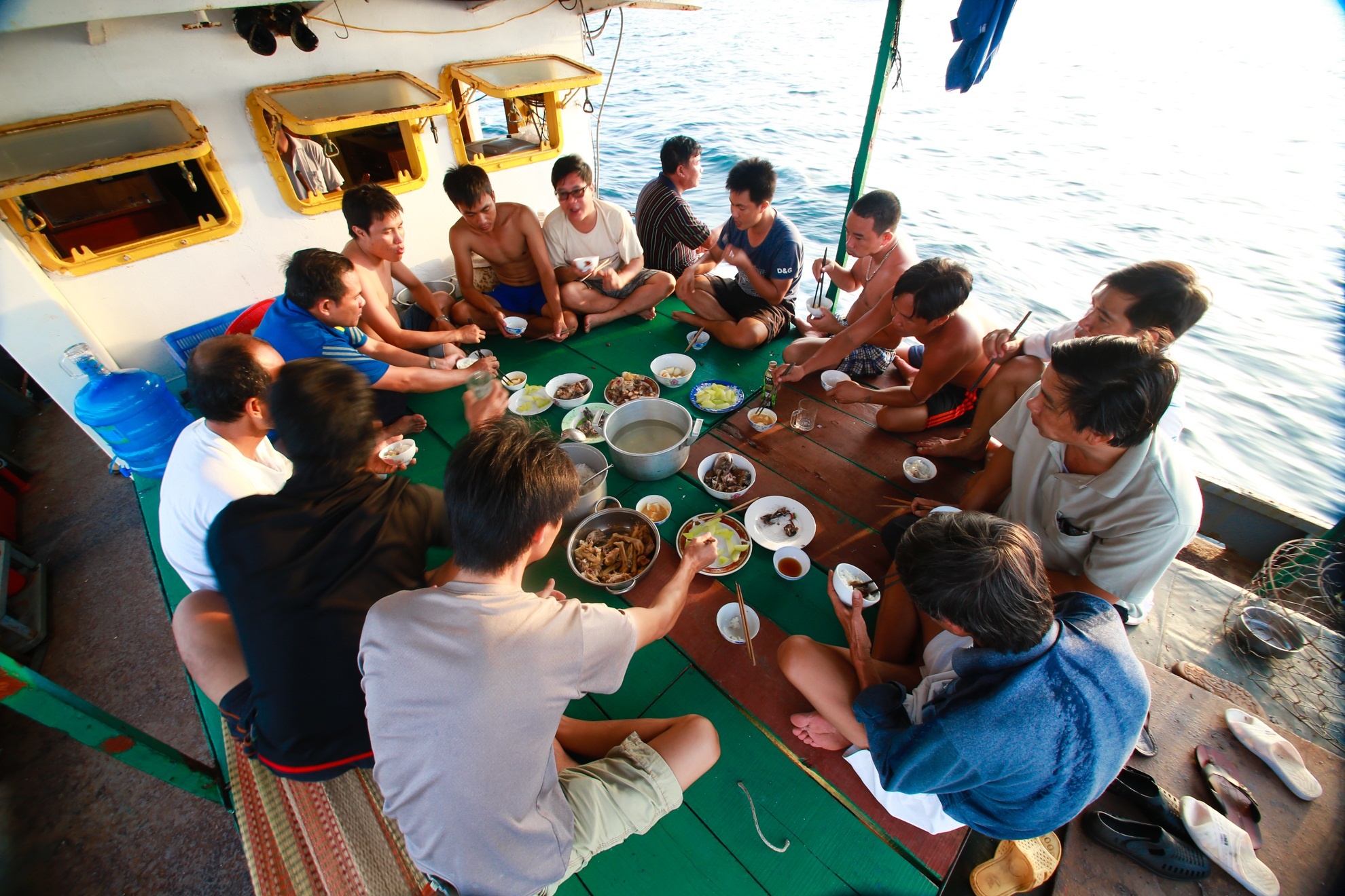 | Những người phải trực trên đảo nay được về vui mừng bên mâm cơm cùng các anh em thủy thủ tàu. Thông thường sau 4 tháng ngoài đảo họ sẽ được nghỉ ngơi khoảng 20 ngày trước khi tiếp tục hành trình thắp sắng và bảo vệ những ngọn hải đăng khác trên vùng biển chủ quyền của Việt Nam. |