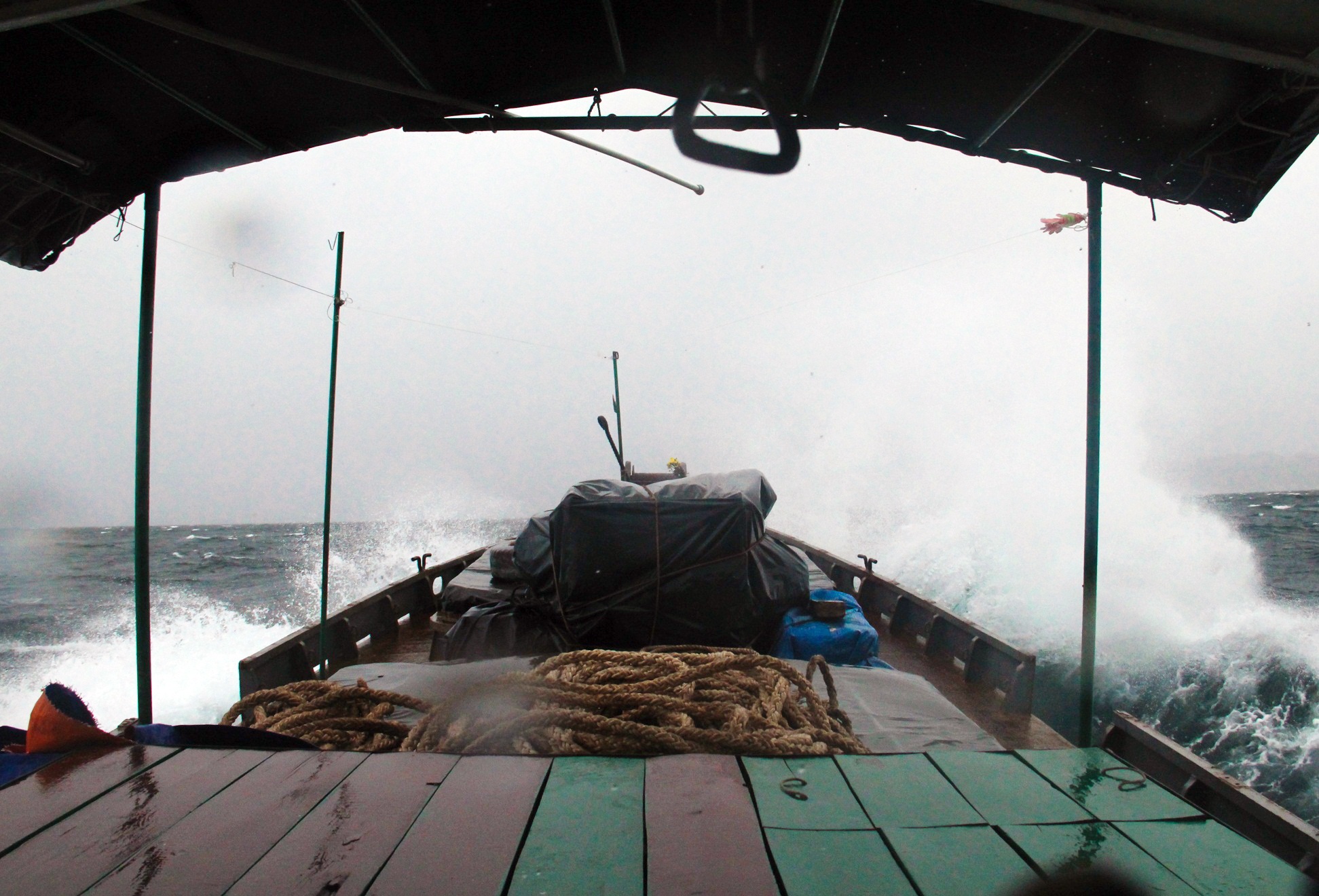 Nước bắn rất mạnh từ các con sóng tạt vào khoang lái tàu. Anh Tuấn, một trong những thuyền trưởng giỏi và lâu năm nhất (30 năm) của công ty căng mắt chịu trận để điều khiển. Đêm đầu tiên, biển động quá mạnh mọi người phải tránh bão ở Mũi Dinh, đêm tiếp theo tàu neo tạm ở đảo Phú Quý, đến khoảng 0h sóng yên biển lặng đoàn mới tiếp tục ra đảo Hòn Hải. Tổng cộng thời gian đi và về là hơn 300 hải lý mất khoảng 62 giờ đồng hồ.
