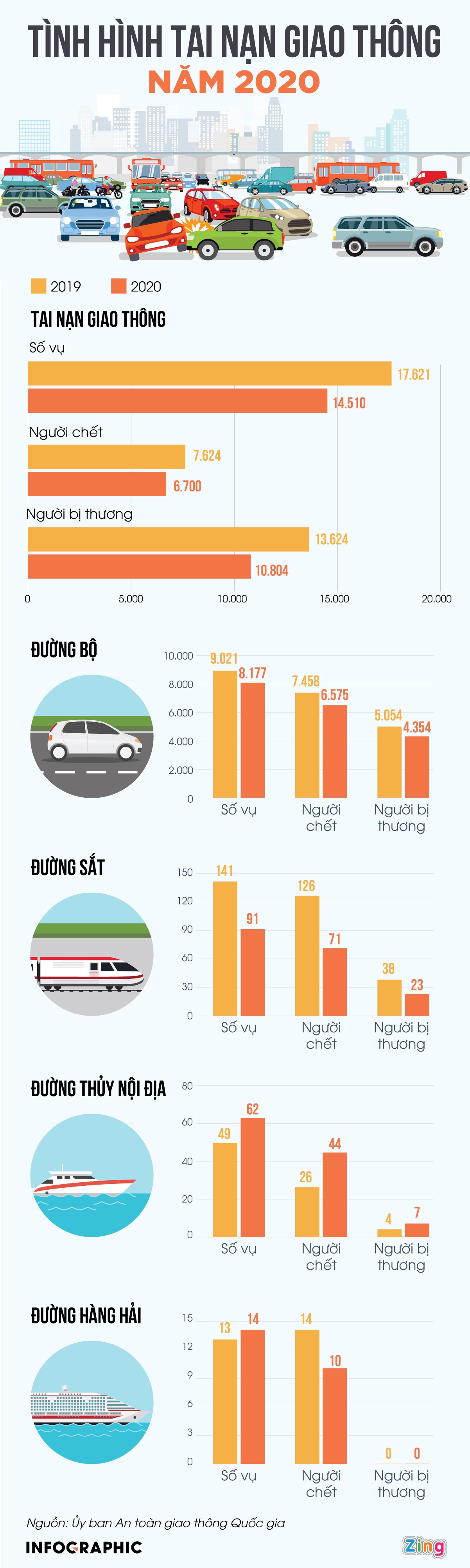 Năm 2020, cả nước xảy ra 14.510 vụ tai nạn giao thông, làm chết 6.700 người, bị thương 10.804 người. So với năm 2019, cả 3 tiêu chí này đều đã giảm.
