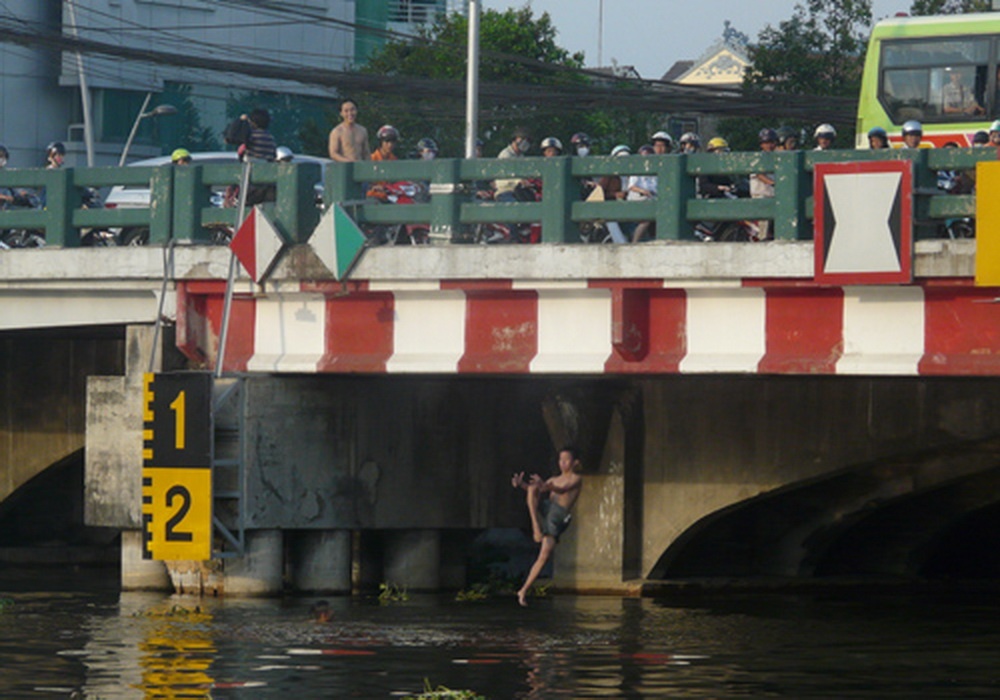 Xe 2 bánh lưu thông qua 2 cầu tạm bằng sắt ở bên cạnh cầu Bông bắc qua kênh Nhiêu Lộc - Thị Nghè.