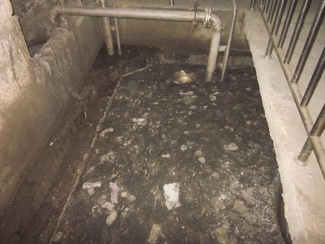 | Bên trong toà chung cư The Manor, tại nơi xử lý chất thải, cặn chất thải rắn dày đặc như xi măng, do không được thường xuyên xử lý. |