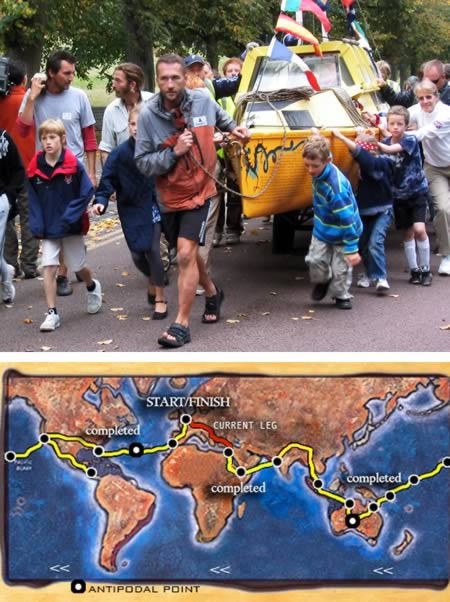 Nhà thám hiểm người Anh Jason Lewis là người đi vòng quanh thế giới bằng sức người (chèo thuyền, đi bộ, giày trượt...). Anh xuất phát trên một chiếc thuyền 8 m tại sông Thames hồi tháng 7/1994. Ngày 6/10/2007 Lewis về đến Greenwich, phía đông London và kết thúc chuyến vòng quanh thế giới suốt 13 năm. Trong quãng đường dài hơn 74.000 km, Lewis gặp vô vàn khó khăn. Anh từng gặp tai nạn đắm tàu ở Đại Tây Dương, Thái Bình Dương và một phần Ấn Độ Dương. Trong khi băng qua nước Mỹ trên đôi giày trượt, hai chân của Lewis đều gãy do tai nạn ô tô. Lewis cũng từng bị cá sấu ở Australia săn đuổi, bị cảnh sát Ai Cập thẩm vấn do nghi ngờ anh là gián điệp.