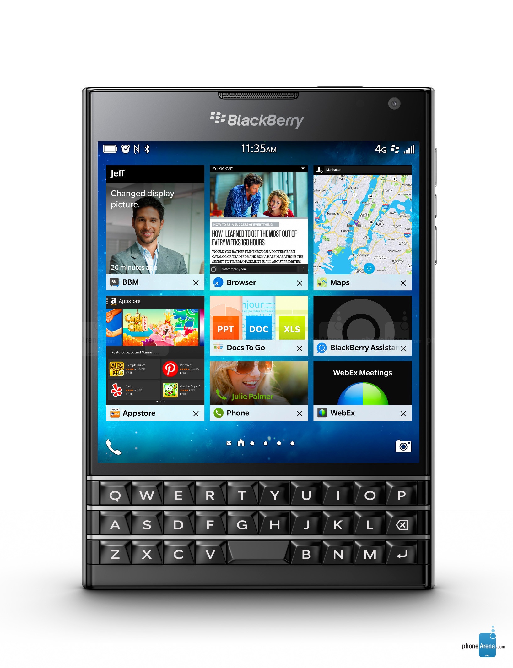 BlackBerry trình làng Passport đầu năm 2014 nhưng đến tháng 9 mới bán ra. Passport là “của hiếm” trong làng smartphone nhờ thiết kế vuông vức không giống ai, thậm chí nhiều người còn so sánh nó như một cái bếp từ. Thiết bị dùng màn hình vuông 4,5 inch, độ phân giải 1.440 x 1.440 pixel, bàn phím QWERTY ba hàng có thể dùng như touchpad.