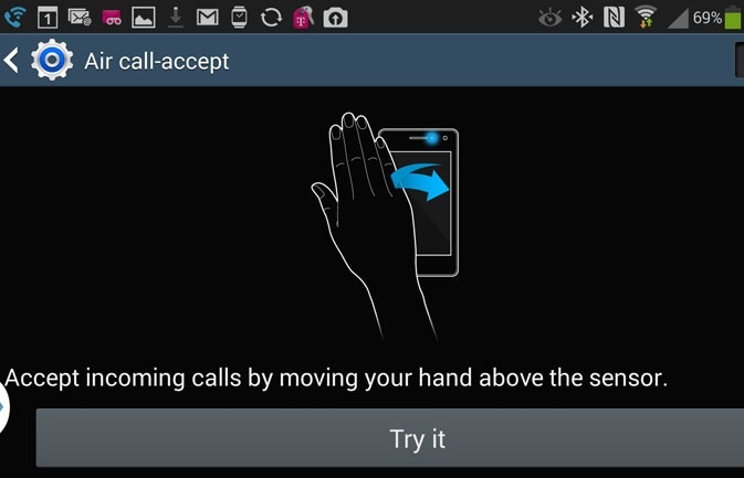 3. Air call-accept: Nếu bạn không muốn chạm tay vào màn hình để trả lời điện thoại, Samsung cung cấp cho bạn tính năng có tên Air call-accept. Chỉ cần vẫy tay vài cái (giống như bạn tát vào một phần vô hình, cách màn hình khoảng vài inch) bạn có thể trả lời cuộc gọi. Tính năng này được thiết kế cho việc lái xe nhưng vấn đề là, bạn muốn vuốt màn hình trong 1 giây hay vẫy phía trước nó trong khoảng 10 giây để trả lời một cuộc điện thoại?