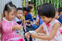 | Trẻ mầm non 4 tuổi và phụ huynh trường Mầm non Bạch Đằng cách ly tập trung ngay tại trường. Ảnh: Vũ Huệ. |