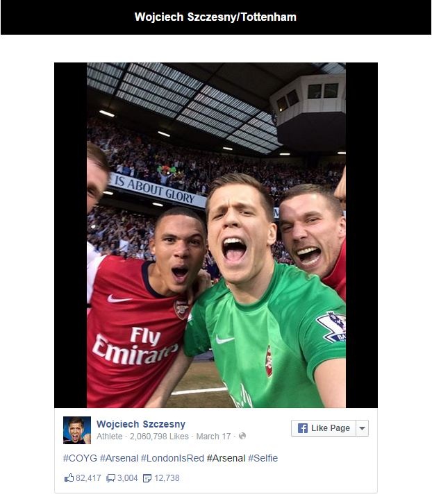| Phấn khích sau chiến thắng 1-0 của Arsenal trước Tottenham trong trận derby phía bắc thành London ở cuối mùa giải năm ngoái, thủ thành Wojciech Szczesny đã chụp một kiểu ảnh "tự sướng" cùng Kieran Gibbs và Lukas Podolski, rồi tung lên facebook. Bức ảnh như trêu tức các CĐV của sân White Hart Lane sau đó đã trở thành đề tài gây tranh cãi giữa các fan hai đội. |