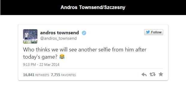 | Cơ hội để các fan và cầu thủ Tottenham trả đũa Szczesny đến chỉ 1 tuần sau đó. Ngay khi Arsenal nhận thất bại tan nát 0-6 trong một trận derby thành London khác với Chelsea, tiền vệ Andros Towsend của Spurs tweet: "Ai mà nghĩ được chúng ta lại có cơ hội xem cậu ta thực hiện một bức ảnh 'tự sướng' sau trận đấu hôm nay". |