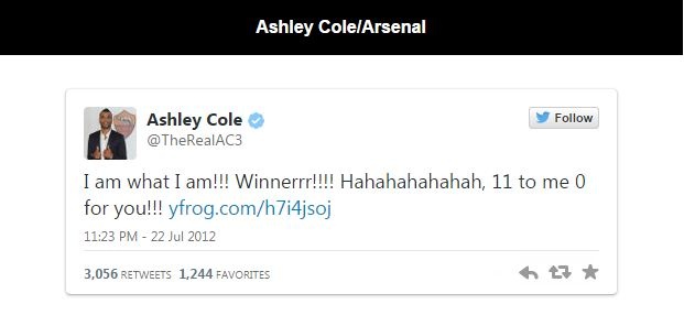 | Bất ngờ chuyển sang đầu quân cho Chelsea ở kỳ chuyển nhượng mùa hè 2006, Ashley Cole trở thành một kẻ phản bội không hơn không kém trong mắt các CĐV Arsenal. Như muốn giải tỏa nỗi lòng khi phải nhận những chỉ trích nhắm vào mình, Cole đã trưng dòng trạng thái xoáy sâu vào nỗi đau 8 năm liên tiếp trắng tay của các Pháo thủ khi vừa cùng The Blues đăng quang Champions League 2011/12: "Tôi là người chiến thắng! 11 danh hiệu cho tôi và 0 cho các bạn". |