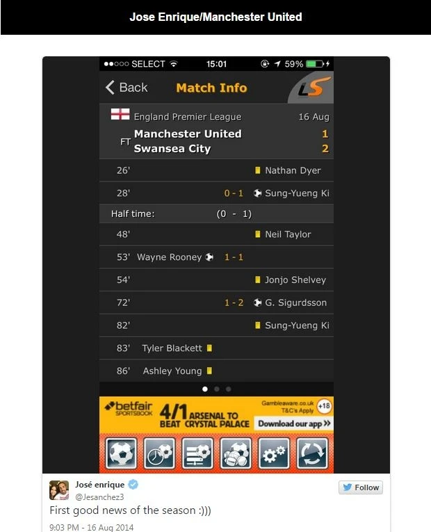 | Mỗi thất bại của M.U đều dễ dàng trở thành đề tài châm biếm, đặc biệt từ các anti-fan hoặc những ngôi sao khoác áo đội bóng kình địch. Chứng kiến Quỷ đỏ nhận trận thua bất ngờ 1-2 trước Swansea ngay tại Old Trafford trong trận mở màn mùa giải mới, hậu vệ Jose Enrique của Liverpool được dịp hả hê: "Tin tốt đầu tiên của mùa giải". |