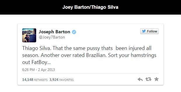| Tính cách ngỗ ngược của Joey Barton chẳng lạ gì với người hâm mộ thường xuyên theo dõi Premier League. Tuy nhiên, ngay cả khi đã chuyển sang Pháp đầu quân cho Marseille, tiên vệ người Anh vẫn chứng nào tật nấy. Chẳng biết có thù oán gì với Thiago Silva hay không mà "ngựa chứng" 32 tuổi có lời nhận xét khá vô duyên về trung vệ đội trưởng của PSG. Theo Barton, Silva chẳng khác nào một gã đồng tính, một kẻ õng ẹo như đàn bà. Dù sau đó phải đăng đàn gửi lời xin lỗi đến ngôi sao người Brazil nhưng cựu ngôi sao Man City vẫn phải nhận án treo giò 2 trận từ LĐBĐ Pháp và rất nhiều lời chỉ trích từ người hâm mộ. |