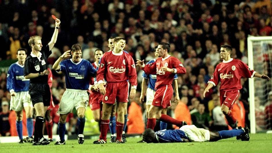 | Liverpool 0-1 Everton (27/9/1999): Ở mùa giải thứ 2 khoác áo đội một Liverpool, Steven Gerrard đã là gương mặt quen thuộc nơi tuyến giữa và thi đấu rất chững chạc bên cạnh đàn anh Jamie Redknapp. Tuy nhiên, lối chơi máu lửa của Gerrard khiến anh phải nhận tấm thẻ đỏ đầu tiên trong sự nghiệp ở trận derby vùng Merseyside với Everton. Ngôi sao 19 tuổi có pha vào bóng cao chân với tiền đạo Kevin Campbell sau khi được tung vào sân ở hiệp 2 thay Robbie Fowler. |