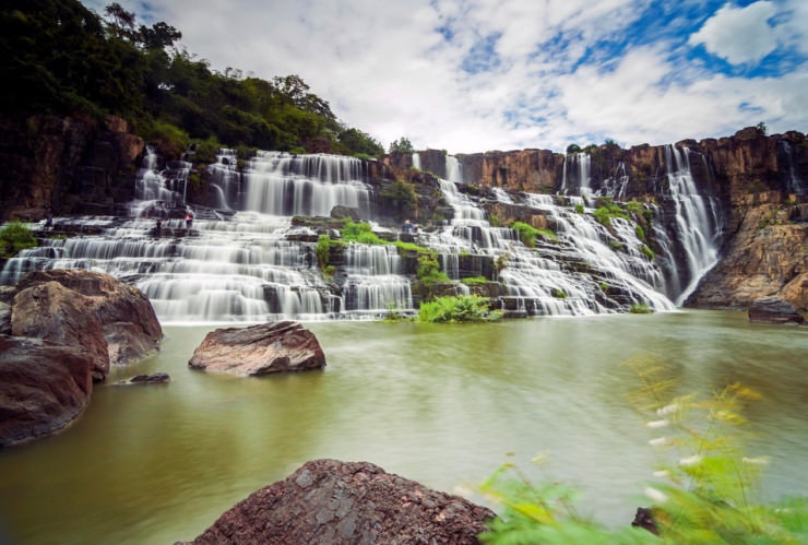 6. Thác Pongour, Đà Lạt: Đà Lạt nổi tiếng là thành phố lãng mạn với những thung lũng, suối hồ, đồi núi. Trong số các thác nước, thác Pongour gây ấn tượng bởi vẻ thơ mộng và được bao phủ bởi rừng rậm hoang sơ. Thác cao khoảng 40 m, rộng khoảng 100 m. Những bậc đá tại đây tạo cảm giác như đi vào một nhà hát tự nhiên.