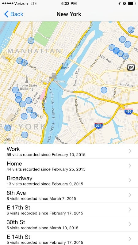 iPhone ghi lại tất cả những địa điểm mà họ đã lui tới trong ngày. Để làm được điều này, người dùng có thể vào Setting > Privacy > Location Services > System Services, sau đó kéo xuống dưới chọn vào dòng Frequent Locations và nhìn vào lịch sử các địa điểm đã ghé qua. Tuy nhiên, trên iOS 8.3, tính năng này đã ẩn đi phần bản đồ để bảo vệ sự riêng tư.