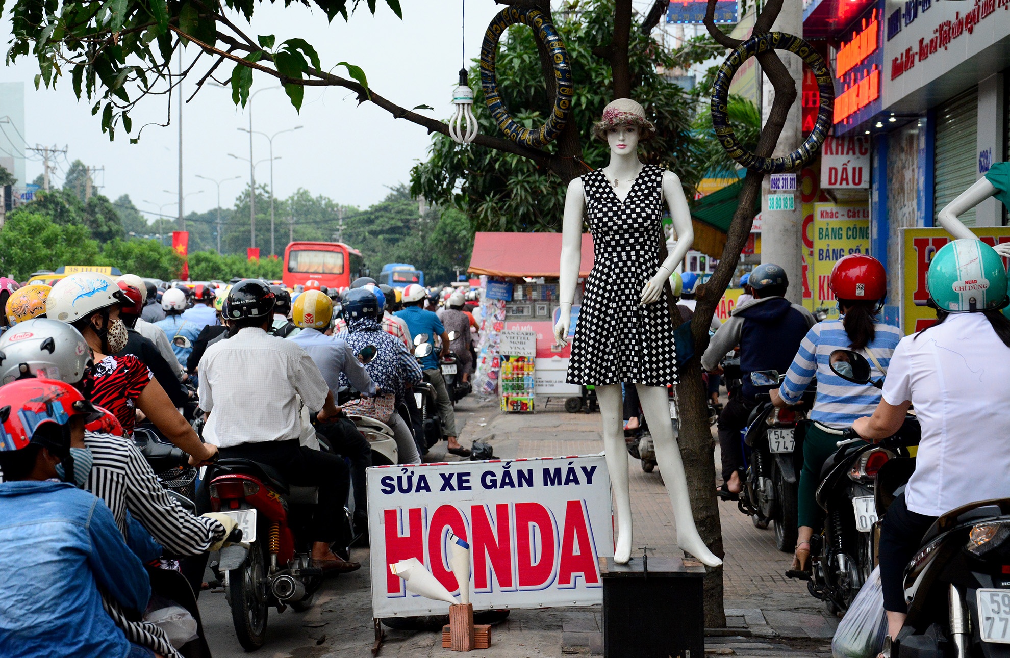 Lấn chiếm vỉa hè, lòng đường. Người dân TP cũng rất bức xúc trước tình trạng lấn chiếm vỉa hè, kinh doanh tràn xuống cả lòng đường khiến xe lưu thông khó khăn, mất trật tự an toàn giao thông. Trong ảnh: Một cửa hàng kinh doanh quần, áo trên đường Cộng Hòa, quận Tân Bình dựng cả ma-nơ-canh bên vỉa hè, phía xa là những điểm bán hàng ở lòng đường. Đây là một trong những tuyến đường nổi tiếng về kẹt xe ở TP HCM. Ông Phan Cường phản ánh: “Tôi rất bức xúc tình trạng lấn chiếm vỉa hè, tràn cả lòng đường khiến xe lưu thông khó khăn, mất trật tự. Hy vọng Bí thư Thành ủy Đinh La Thăng sẽ sớm giải quyết”. |