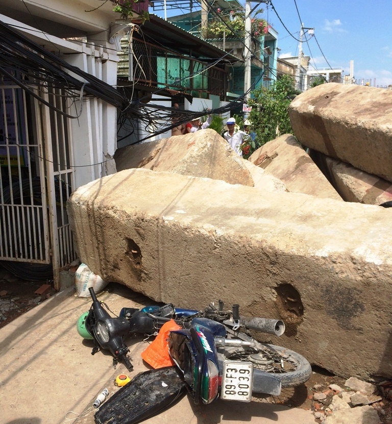 Theo người dân, thời điểm trên, khi cần cẩu công trình đang thi công thì 8 khối bê tông trong khuôn viên công trình xây dựng cầu Chợ Đệm bất ngờ đổ sập xuống con hẻm tại khu phố 1.