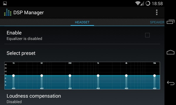 Thay vì phải điều chỉnh các dải âm cho từng ứng dụng, bạn có thể kích hoạt ứng dụng chỉnh âm DSP Manager cho toàn bộ các ứng dụng có trên tablet/smartphone. Các fan của âm nhạc có thể "kích" tiếng bass hoặc lựa chọn các bộ điều chỉnh (preset) phù hợp với thể loại nhạc mà bạn muốn nghe.