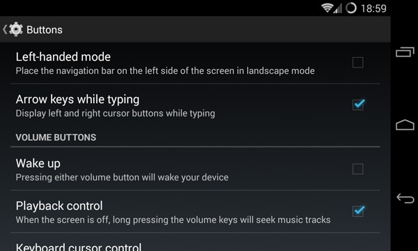 Tính năng Buttons sẽ giúp bạn lựa chọn các chức năng phù hợp hơn cho các nút bấm trên Android. Ví dụ, nếu không sử dụng tai nghe có nút tăng/giảm âm lượng, bạn có thể thay đổi tính năng của các nút âm lượng trên thân máy thành các nút chuyển bài hát. Bằng cách này, bạn sẽ không còn cần phải bật màn hình mỗi lần muốn chuyển bài.