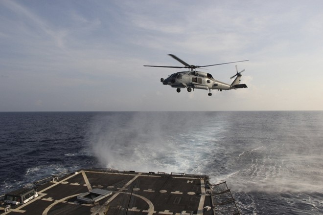 | Trực thăng khởi hành từ tàu khu trục USS Pickney đi tìm kiếm máy bay mất tích. Ảnh: The Malay Mail. |