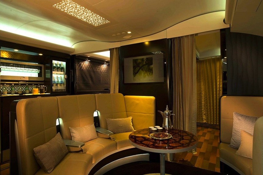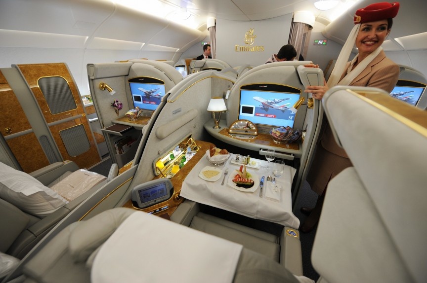 1. Emirates - 30.000 USD (Los Angeles - Dubai) Trên chiếc máy bay A380, hành khách khoang hạng nhất của Emirates có thể tắm ở độ cao hơn 12 km nhờ spa được thiết kế tuyệt đẹp bằng đá cẩm thạch và bộ đồ dùng nhà tắm Bvlgari. Trong buồng cá nhân với cửa ngăn để đảm bảo sự riêng tư, khách có thêm cả quầy bar mini và màn hình tinh thể lỏng để giải trí. Những món ăn được phục vụ trên chuyến bay cũng rất đa dạng và tinh tế, đó có thể là đồ ăn Ả-rập truyền thống hay các món ăn Á- Âu bày trên những chiếc đĩa Royal Doulton, đi kèm cùng bộ dao nĩa Robert Welch. |