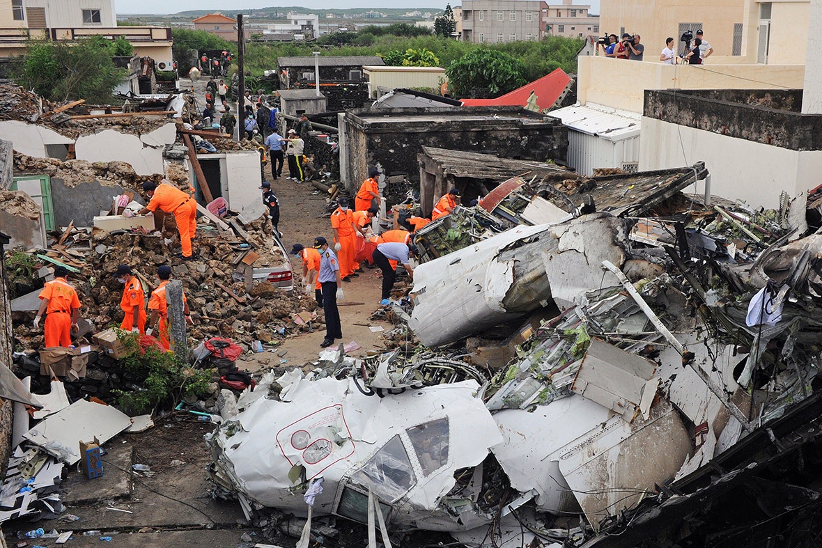 Ngày 23/7/2014, chuyến bay GE222 của TransAsia Airways, hãng hàng không Đài Loan, gặp sự cố khi chuẩn bị hạ cánh xuống sân bay trên đảo Bành Hồ. Điều kiện thời tiết xấu khiến chiếc ATR72 không thể đáp xuống sân bay trong lần hạ cánh đầu tiên. Khi phi công cố thực hiện lại cú tiếp đất, máy bay gặp sự cố và lao xuống khu dân cư làm 48 người thiệt mạng và 11 người khác bị thương. Ảnh: Reuters |